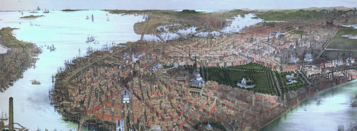 Image: Bachmann, John, and L. Prang & Co. Boston Bird’s-Eye View from the North. [N.p. L. Prang & Co., 1877.] Map. Retrieved from the Geography and Map Division, Library of Congress. The Library of Congress is not aware of any U.S. copyright protection or any other restrictions in the Map Collection materials.